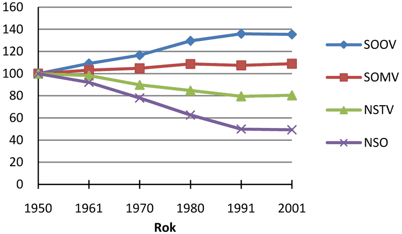 Zajímavější je graf vývoje počtu domů v Královéhradeckém kraji (obr. 5), byť je jeho interpretace poněkud komplikovaná a na první pohled jako by se uplatňování střediskové soustavy příliš neprojevovalo.