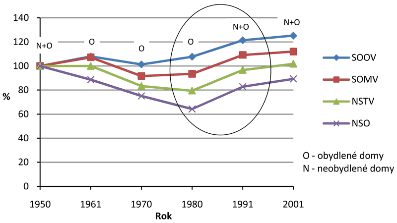 Bereme-li v potaz tyto skutečnosti, zjišťujeme, že v dekádě 1961–1970 dochází k poklesu počtu domů ve všech typech sídel, ovšem ve střediscích je toto pravděpodobně způsobeno výstavbou bytových (panelových) domů. Vliv střediskové soustavy je viditelný mezi lety 1970 a 1980, kde diferenciace odpovídá vesměs trendům vývoje počtu obyvatel v jednotlivých kategoriích sídel.