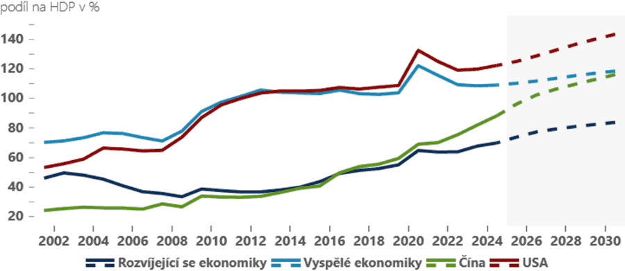 bude zejména dílo vyspělých ekonomik, které těží z toho, že mají historicky větší dluhopisové trhy, výraznější možnosti financování a ve finále i trpělivější investory ochotné „zkousnout“ i vyšší míry zadlužení. Vyspělé země mají již dnes úroveň zadlužení na 120 % HDP a v nejbližších pěti letech jim bez zásadních reforem má vzrůst zadlužení nad 130 % HDP. Rozvíjející se ekonomiky hlásí také rostoucí zadlužení, ale kvůli přísnější „kontrole“ trhů jsou s výjimkou Číny (jejíž veřejný dluh příští rok překoná 100 % HDP) úrovně dluhu výrazně nižší.