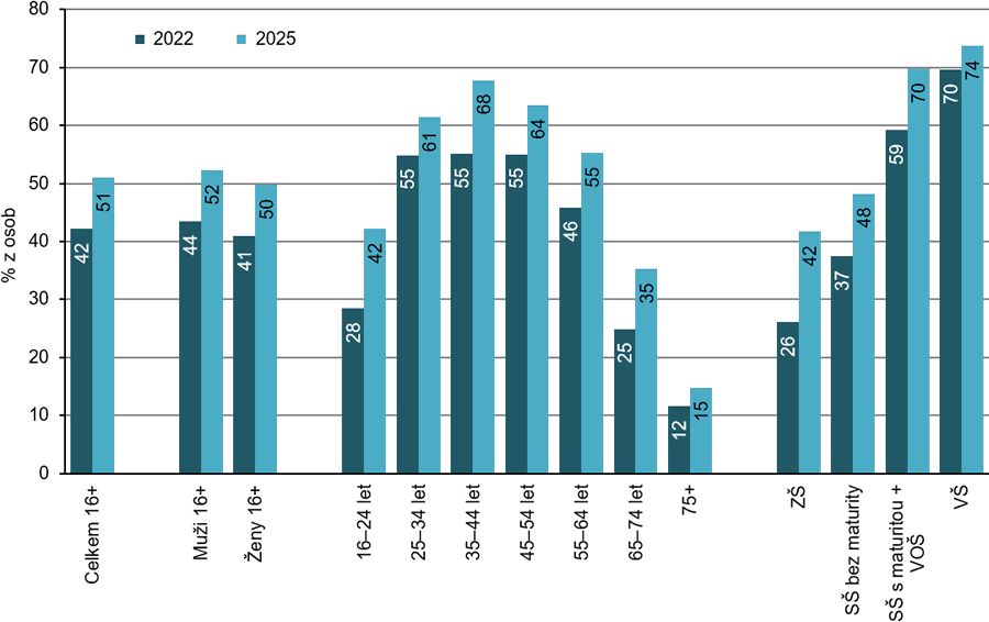 Dynamicky se rozvíjí i využívání nástrojů umělé inteligence, které v roce 2025 používala v Česku třetina osob ve věku 16 a více let. Jde o obdobný podíl jako byl celounijní průměr. Nejčastěji je používají mladí lidé ve věku 16 až 24 let (78 % osob), zatímco u seniorů nad 65 let to jsou pouze 4 %. Podniků, kde využívaly v minulém roce umělou inteligenci, bylo 18 %. Jde o trojnásobný podíl oproti roku 2023. Nejčastěji tyto technologie ze zemí EU používaly v roce 2025 podniky v Dánsku (42 %), ve Finsku (38 %) a ve Švédsku (35 %).