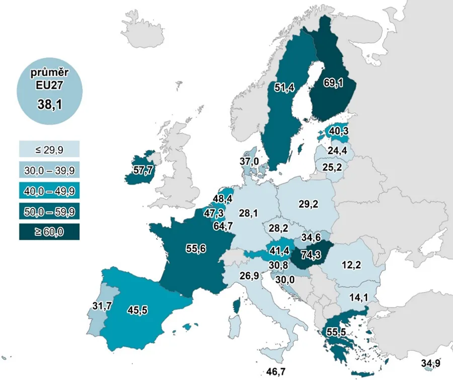 Kartogram 1. Osoby v zemích EU, které si stáhly formulář k vyplnění ze stránek veřejných institucí, 2024 (% z osob ve věku 16 až 74 let.)