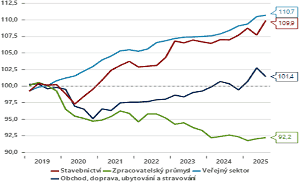 Hrubým odhadem tak v letošním roce platy porostou ve veřejném sektoru, který zaměstnává přibližně půl milionu lidí, tempem okolo 7 %. To je nad úrovní očekávaného růstu průměrné mzdy v celé ekonomice, který odhadujeme mezi 5–6 %. Je však dobré připomenout, že od roku 2021 platy státních zaměstnanců rostly pomaleji než v soukromé sféře a v mnoha případech zůstává jejich reálná hodnota nižší než v roce 2019.