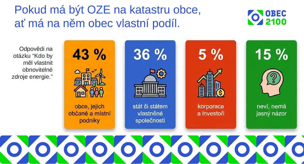 Nejvíce obcí (43 %) je přesvědčeno, že vlastníky nových obnovitelných zdrojů energie a hlavními příjemci z toho vyplývajících výhod by měly být obce, jejich občané a místní podniky. Druhou nejčastěji zmiňovanou možností byl stát a státem vlastněné společnosti (36 %). Naopak soukromé korporace uvedlo pouze 5 procent obcí.